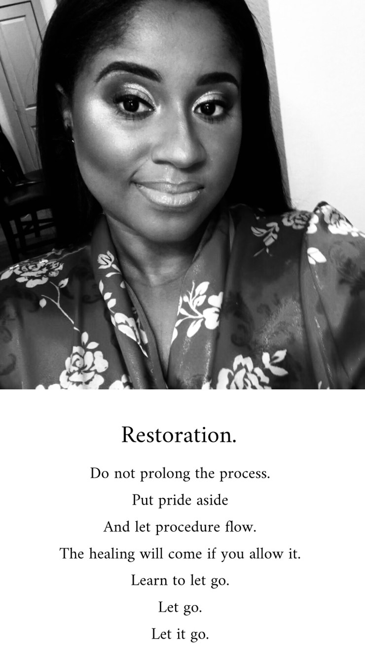 I feel as if my restoration takes on many forms. Some days it’s the laughter that brings me to tears. The ridiculousness of how lost I thought I would be without that person or that thing. Other times it is the look of approval that I give myself in the mirror. The realization that I’m still beautiful, still confident, still loved and still living without you. Fully living. More alive than I was with you. More than I’ll ever be without you. Alive and well. Purposefully living.